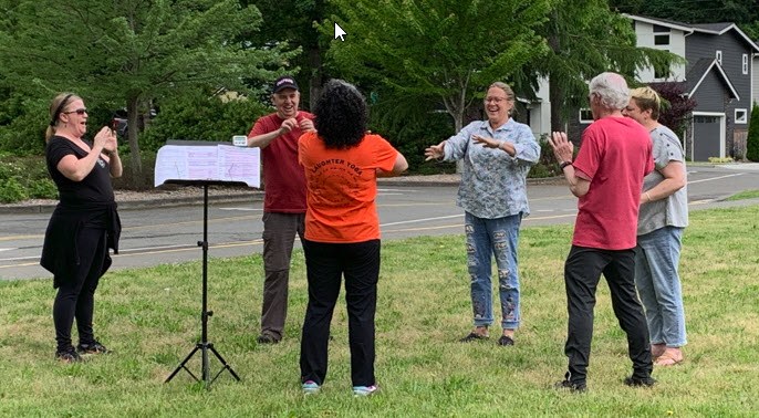 In the grass area under the huge tree in the parking area. I will have a music stand and likely be wearing some version of a “HA” T-shirt.